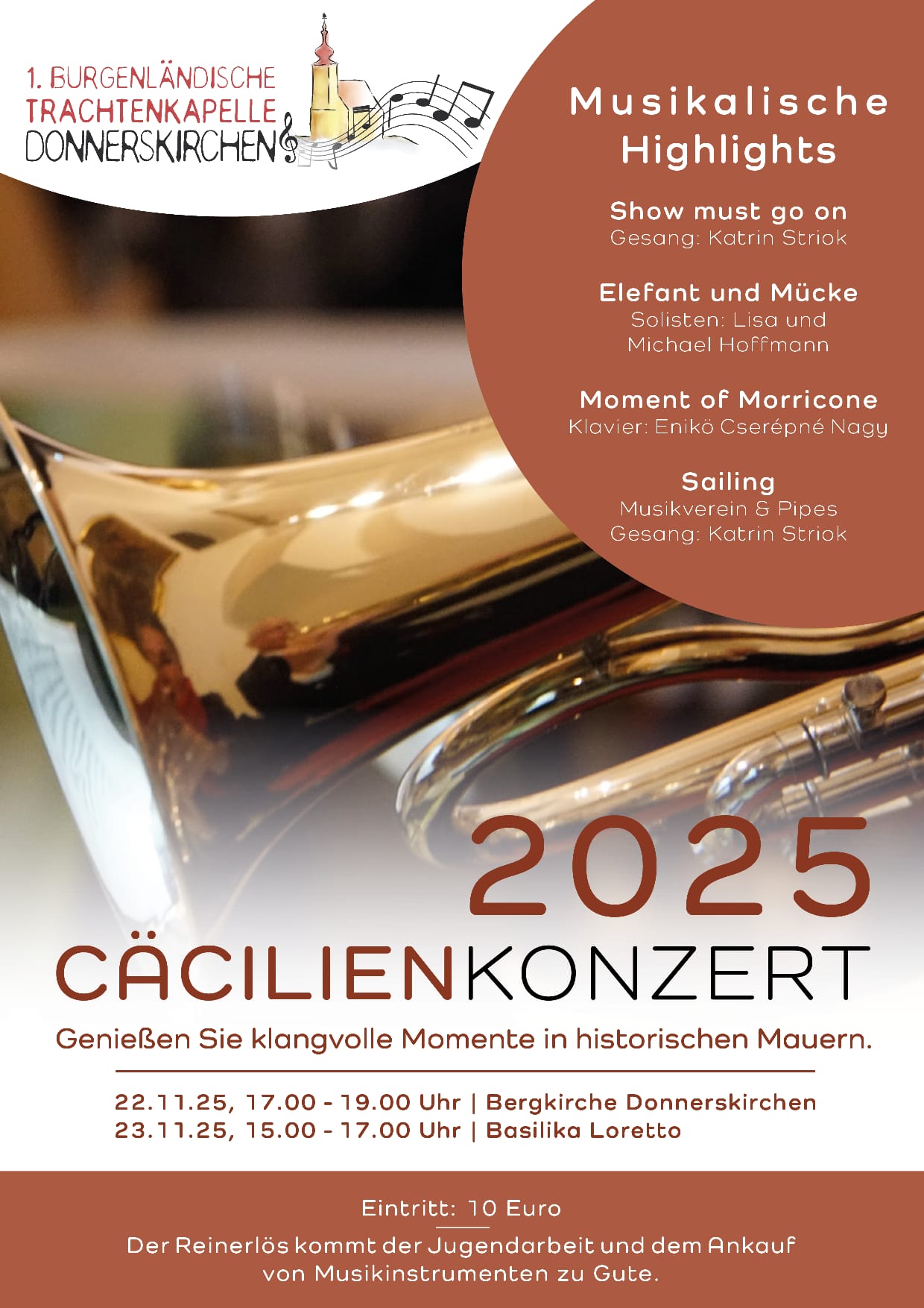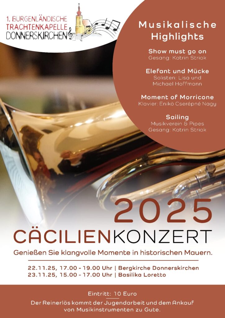 Nachdem in den letzten Jahren die Donnerskirchner Bergkirche aufgrund der zahlreichen Besucherinnen und Besucher beim Cäcilienkonzert aus allen Nähten geplatzt ist, haben wir uns wie im Vorjahr dazu entschieden unser traditionelles Konzert zu Ehren der Schutzpatronin der Musikerinnen und Musiker nicht nur in Donnerskirchen, sondern auch wieder in der Basilika in Loretto aufzuführen. Womit wir allerdings nicht gerechnet hatten war, dass sich die weit größere Basilika mit interessierten Zuhörern ebenfalls bis auf den aller letzten Platz gefüllt hatte, um den Klängen der 1. Bgld. Trachtenkapelle Donnerskirchen, den Drums & Pipes Gordon Highlanders of Austria zu lauschen. Unser Kapellmeister Thomas Schrammel stellte gemeinsam mit uns ein vielfältiges Programm zusammen, dass einen weiten Bogen durch alle musikalischen Stilrichtungen spannte. Zu hören waren Stücke wie „Circle of Life“ genauso wie „Forrest Gump“, „Faith of the Gods“, „Proud Mary“ oder „Celtic Crest“ . Das Ganze wurde natürlich auch mit herrlichen Sologesängen von Katrin Striok, Alexandra Rohrer und Luis Rohrer untermalt. Nach dem von Luis Rohrer arrangierten Stückes des Songs „Welch ein Geschenk ist ein Lied“ von Reinhard Mey gab es dann wie gewohnt das Grande Finale gemeinsam mit den Drums & Pipes Gordon Highlanders unter der Führung ihres Pipe Major Bernhard Pock und dem Stück „Highland Cathedral“.